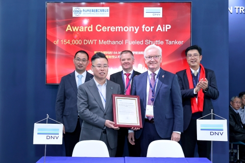 12月5日,在第21届中国国际海事展上,舟山中远海运重工《甲醇双燃料154000DWT穿梭油轮》设计项目获得DNV船级社颁发的原则性认可(AiP)证书。这是继《LNG双燃料152000DWT穿梭油轮》设计项目后,再次获得DNV船级社原则性认可,设计项目更具有市场前景和示范意义。 DNV船级社大中华区总经理 Norbert Kray、大中华区南区总经理陈铿、中国区技术中心总监Oyvind Pettersen,舟山中远海运重工执行董事、党委书记、总经理周建华、副总经理苏宇参加证书颁发仪式。 在国际海事组织碳排放政策及国家“双碳”战略等多重背景下,甲醇(绿色)作为一种清洁能源,目前具有成为世界主流船舶燃料的趋势,各大顶尖航运公司也纷纷押宝甲醇(绿色)燃料。与常规重油燃料相比,甲醇(绿色)作为船用燃料,热值适当,安全性高,可减少100%的碳排放、95%以上的硫氧化物和颗粒物以及60%的氮氧化物。 近年来,舟山中远海运重工始终紧抓市场需求,围绕绿色新发展理念,加大技术科研力度,《LNG双燃料Aframax油轮》《LPG双燃料151000DWT穿梭油轮》《LNG双燃料152000DWT穿梭油轮》《5500HP纯电智能拖轮》等多个设计项目获得LR、DNV、CCS原则性认可。 未来,舟山中远海运重工将紧随市场需求,加强技术储备,持续开发环境亲和、智能化、能耗低的绿色船型,为中远海运集团打造“绿色、低碳、智能”航运创造价值。(陈云)