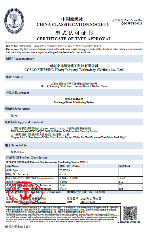 近日,由南通远洋配套/威海重工科技自主研发的排放水监测系统取得中国船级社的型式认可证书。 “海盾”排放水监测系统应用于船舶废气脱硫设备中,用于监测船舶脱硫前后洗涤水的pH值、浊度、多环芳烃(PAHs)等关键指标。该系统采用高精度、高灵敏度的传感器,可实时提供监测数据;通过灵活的先进设计方案,适应新造船和改造船不同船型的空间布置要求;其电控系统由公司自主研发,操作界面新增了传感器使用时间和校准时间的记录及提示功能、传感器历史数据曲线查看以及故障自诊断说明等功能,能够及时提示船员校准或更换仪器,更加灵活满足船员低故障率、操作和维护简便的要求。 该产品的成功研发,标志着“海盾”品牌产品再添新成员。依托“海盾”品牌全球服务网络、重点港口备件仓库以及24小时售后值班制度,可确保船舶航行无忧。未来,南通远洋配套/威海重工科技将加大在船用新能源和环保设备领域的研发力度,力争成为中国船舶配套领域装备研发制造的领军者和科技创新的排头兵。(张林岗/文 刘思鹏/摄) |