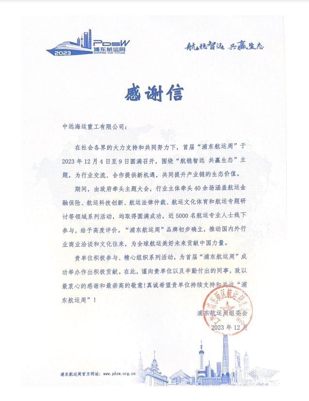 日前,中远海运重工收到了来自浦东航运周组委会发来的感谢信,对公司在首届“浦东航运周”中成功牵头举办航运科技创新领域系列活动表示由衷感谢,对公司在中国海事展期间表现的专业能力和精神面貌表达了高度的赞赏。组委会表示这对于“浦东航运周”的品牌建设,提升全产业链新生态价值,推动国内外行业商业洽谈和文化往来具有重要意义。 首届“浦东航运周”活动主题为“航稳智远